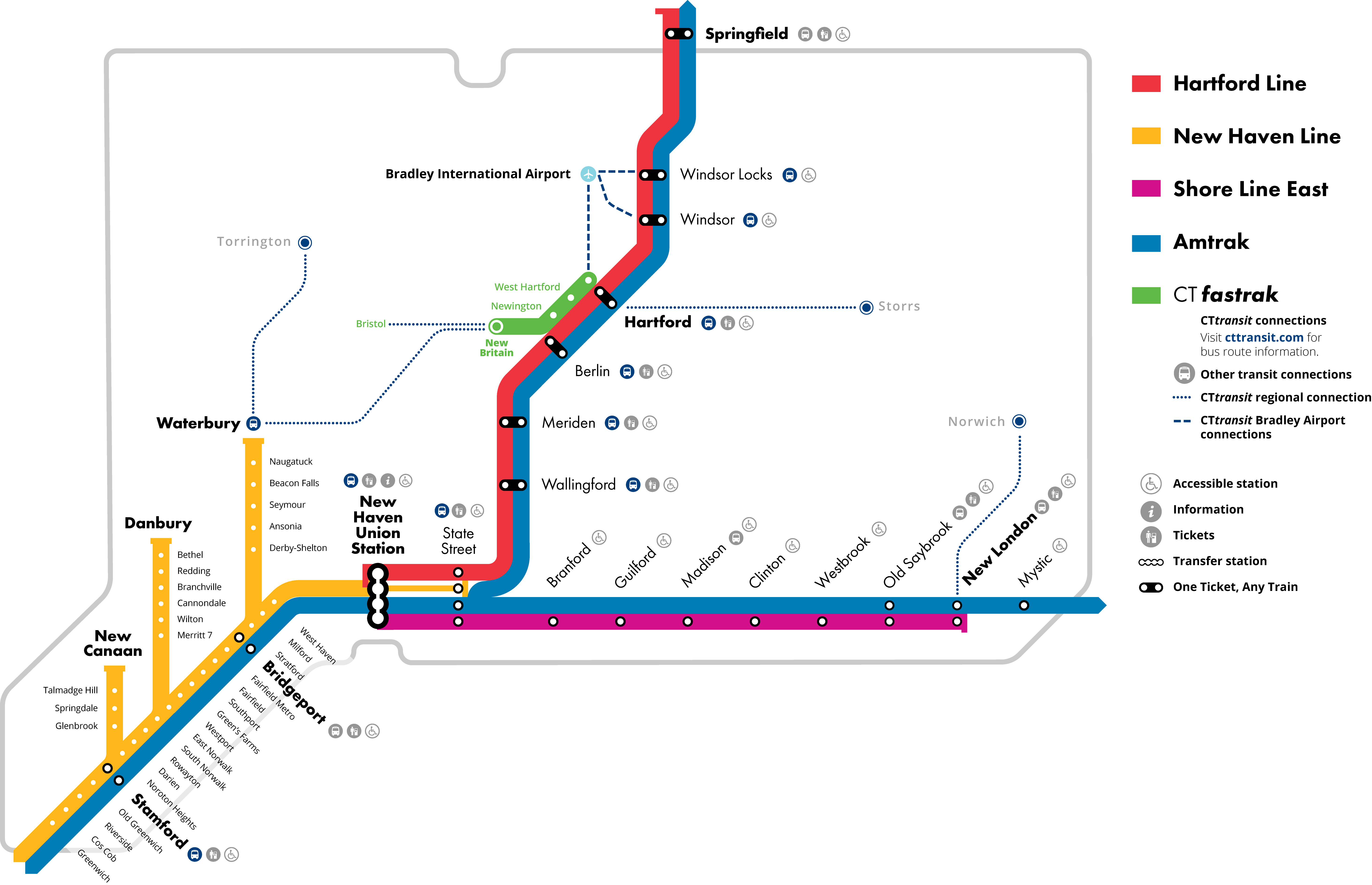 Provides service between New Haven and Grand Central Terminal in NYC, with branch lines extending to New Canaan, Danbury, and Waterbury.